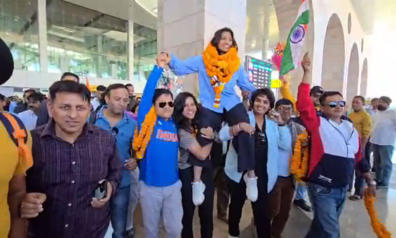 जौलग्रांट एयरपोर्ट पर ढोल नगाड़ों के साथ हुआ ऑलराउंडर स्नेह राणा का जोरदार स्वागत