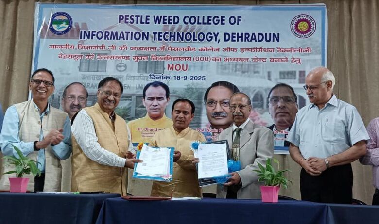 देहरादून। पेसल वीड कॉलेज ऑफ इन्फॉरमेशन टैक्नोलोजी, देहरादून में उत्तराखण्ड मुक्त विश्वविद्यालय के अध्ययन केंद्र बनाये जाने हेतु, उत्तराखण्ड के शिक्षा मंत्री डॉ. धन सिंह रावत की उपस्थिति में, उत्तराखण्ड मुक्त विश्वविद्यालय के कुलपति डॉ. नवीन चन्द्र लोहानी एवं रजिस्ट्रार डॉ. खेमराज भट्ट तथा पेसल वीड कॉलेज के अध्यक्ष डॉ. प्रेम कश्यप जी ने समझौता ज्ञापन पर हस्ताक्षर किए। इस कार्यक्रम के शुभारम्भ में माननीय शिक्षा मंत्री डॉ. धन सिंह रावत, कुलपति (यू.ओ.यू.) डॉ. नवीन चन्द्र लोहानी, कुलसचिव (यू.ओ.यू.) डॉ. खेमराज भट्ट, पेसल वीड कॉलेज के अध्यक्ष डॉ. प्रेम कश्यप, सचिव आकाश कश्यप, प्रबन्धन समिति के सदस्य विनोद शर्मा तथा मेजर जनरल शम्मी सबरवाल, किरन कश्यप, राशि कश्यप तथा पेसल वीड कॉलेज की प्राचार्या डॉ. अनिता वर्मा के द्वारा दीप प्रज्वलन से किया गया। तत्पश्चात छात्रों द्वारा रंगारंग कार्यक्रम की प्रस्तुति की गयी। सभी अतिथिगणों को महाविद्यालय की प्राचार्या डॉ. अनिता वर्मा द्वारा पुष्पगुच्छ एवं शॉल प्रदान कर स्वागत किया गया।